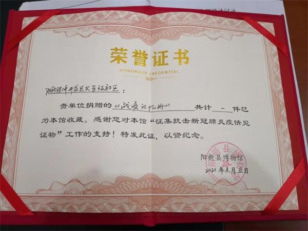 为了更好地记录广大医务人员无私奉献、英勇奋战,广大社会团体、人民群众众志成城、团结奋战的防疫事迹,县博物馆面向社会发布公告,征集抗击疫情见证物。5日,经济开发区火车站社区党总支副书记柯于琴代表向县博物馆捐赠由社区编辑整理的《战疫记忆》宣传画册,县博物馆向其颁发了荣誉证书。