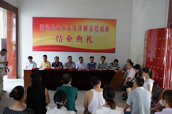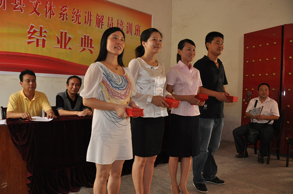 经过几天的紧张学习,在老师严格要求,学生刻苦努力下,712日,由县文体局领导及专家组成的评委会,对学员进行了结业考评,每位学员经过县博物馆展厅事物讲解和所在单位的模拟讲解,最终都取得了优异成绩。经过这次培训,学员的仪表仪态、普通话、语言表达、讲解水平和精神面貌都有了很大的提高,受到专家和领导的一致好评。